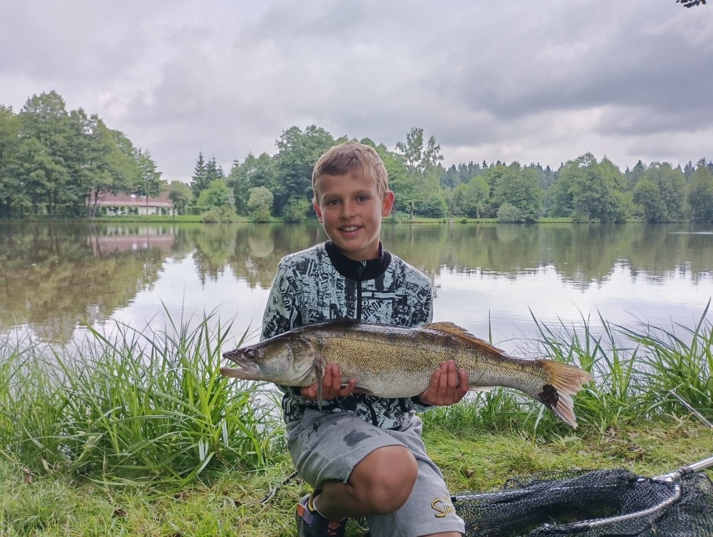 Candát délky 78 cm, chycen na gumu v červenci na rybníku Kuchyně v k.ú. Herálec. Puštěn zpět, lovec Šimon Chyba (10 let)
